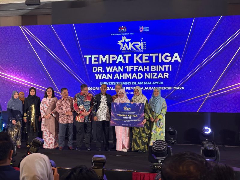 5 Nov 2025 | Kumpulan dari Fakulti Kejuruteraan dan Alam Bina yang diketuai oleh Dr Wan ‘Iffah Wan Ahmad Nizar telah meraih tempat ketiga di Anugerah Khas YB Menteri Pendidikan Tinggi: Rekabentuk Kurikulum Dan Penyampaian Inovatif (AKRI) – Kategori Pengalaman Pembelajaran Imersif Maya – Kanta Kompus. Ahli kumpulan terdiri daripada Prof. Madya Dr. Noor Hayati Ismail, Dr. Nor Syahila Ab Rashid, Prof. Madya Dr. Elina Mohd Husini dan Prof. Madya Dr. Nurul Syala Abdul Latip. Pemenang membawa pulang RM3,000, sijil, serta trofi.